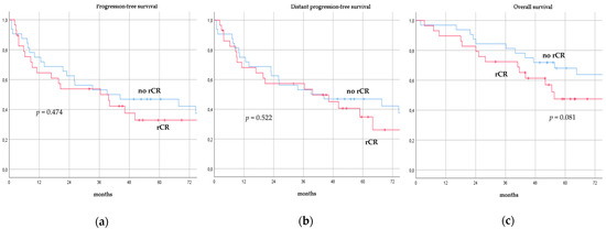 Progression-free survival (a), distant progression-free survival (b), and overall survival (c) curves of de novo metastatic breast cancer patients according to radiologic response after front-line chemotherapy. rCR: Radiologic complete response.