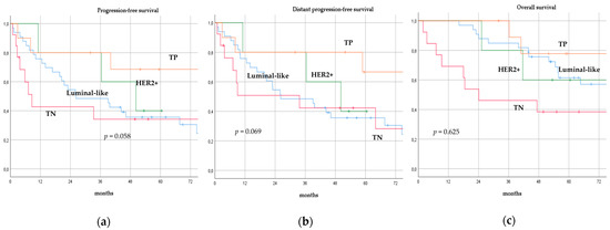 Progression-free survival (a), distant progression-free survival (b), and overall survival (c) curves of de novo metastatic breast cancer patients according to biological sub-type. TP: Triple-positive, HER2+: HER2-enriched, TN: Triple-negative.