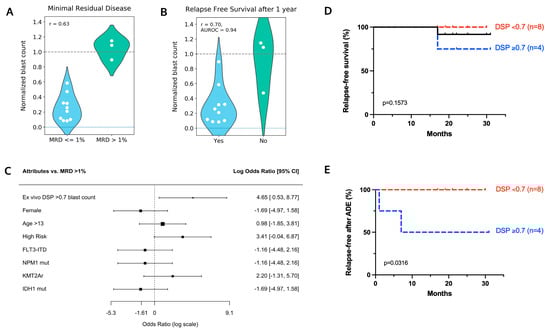 Log odds ratios were used to measure associations between MRD and ex vivo DSP results and clinical attributes. A normalized blast score of 0.7 was applied to distinguish between high (DSP ≤ 0.7) and low sensitivity (DSP > 0.7) to ADE ex vivo. A normalized blast count in the DSP > 0.7 (indicating low sensitivity to ADE ex vivo) demonstrated increased odds of the patient having an MRD > 1% compared with any single genetic feature (FLT3-ITD, NPM1 mutation, KMT2A rearrangement, or IDH1 mutation) or clinical attribute (female, older than 13 years old, high risk) queried (Figure 2C).