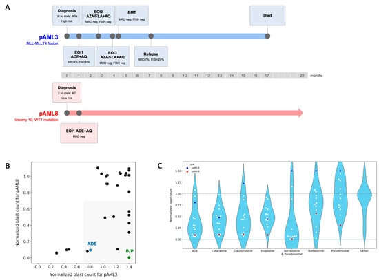 Patients pAML3 and pAML8 both received ADE plus atovaquone for induction chemotherapy. Patient pAML3 failed induction chemotherapy whereas patient pAML8 had no measurable residual disease at the end of induction bone marrow evaluation (Figure 3A). Patient pAML3 was a 16 year-old male diagnosed with the high-risk AML M5a subtype, with cytogenetics significant for MLL-MLLT4 (KMT2A-AFDN) fusion. This patient relapsed after a bone marrow transplant following the successful reinduction of chemotherapy and ultimately died of disease 17 months following diagnosis. Patient pAML8 was a two year-old male diagnosed with the AML M7 subtype, and cytogenetics and molecular testing were significant for trisomy 10 and a WT1 mutation. As this patient was MRD negative at the end of induction, he was classified as being at a low risk of relapse per AAML1831 criteria, and the patient proceeded with chemotherapy alone. Patient pAML8 remains disease-free 22 months following induction chemotherapy.