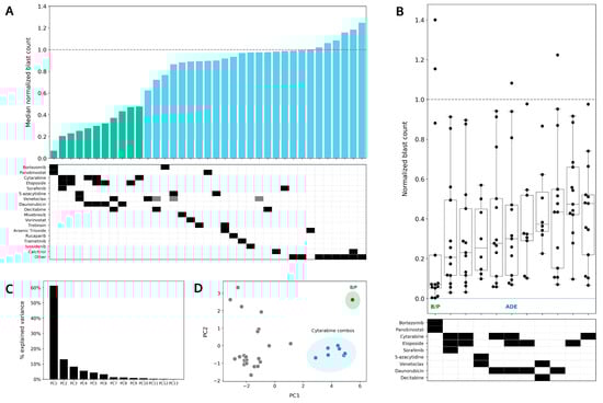 Principal component analysis (PCA) was performed to identify the clustering of conditions that could account for the differences observed in ex vivo drug sensitivity. Sixty percent of the variations in the DSP could be explained by PC1 (principal component 1) and PC2 (principal component 2); these components accounted for <15% of the observed variations (Figure 4C). Using a PC1 vs. PC2 PCA plot, drug combinations with cytarabine (including ADE single agents and combination, DA, cytarabine/etoposide) were found to cluster together and away from other conditions in the DSP, thus indicating that similar drug sensitivity patterns are shared in this cytarabine combination group. Bortezomib, in combination with panobinostat, was found to be the most different from all other conditions tested in the DSP, thus indicating the singularity of this combination when accounting for the differences in ex vivo drug sensitivity patterns.