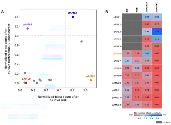 Expanding this comparison to include venetoclax in combination with the HMAs (azacitidine and decitabine (Figure 5A,B)), color-mapping was applied to compare high and low ex vivo sensitivities across patients for each of the four conditions (Figure 5B). Eight patients had ex vivo drug sensitivity results for all four conditions. Within this subset, patient pAML7 showed a greater sensitivity to bortezomib/panobinostat and relatively lower sensitivities to ADE and venetoclax/HMA in the DSP. Patient pAML6, who showed a preferential sensitivity to bortezomib/panobinostat and not ADE, also showed greater sensitivity to venetoclax/HMAs compared with other patients in this cohort.