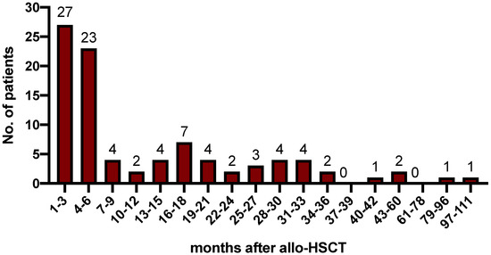 Timepoint of post-transplant relapses. Median time from allo-SCT to relapse was 5.5 months (range 0.5 to 109.8 months), and 30%, 55%, 62%, 80% and 100% relapsed within 3, 6, 12, 24 and >24 months, respectively. No., number.