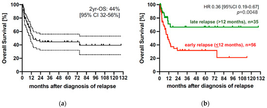 The data lock point at the end of observation was 1 November 2020. For the exploration of continuous variables, median and range were given, and potential differences were investigated using Mann-Whitney test. For categorical variables, frequencies were displayed, and cross-tabulation and Fisher’s exact t-test were used to estimate differences. The time-to-event curves were calculated using the Kaplan–Meier method for overall survival (OS), defined as time from relapse until death or date of last follow-up. For univariate comparison, the log-rank test was used. Multivariate analysis was performed using a multiple Cox regression model with a step-wise backward procedure and included only those variables influencing outcomes in univariate analysis with a p-value of <0.1. A p-value of <0.05 was considered to be statistically significant for all analyses. GraphPad Prism® 5.01 (GraphPad Software Inc., La Jolla, CA, USA) and SPSS for Windows (SPSS Inc., Chicago, IL, USA) were used for all statistical analysis.