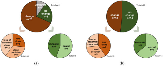 Comparative karyotype analyses prior to allo-SCT and at the time of early relapse (a) or late relapse (b): (a) relapse ≤12 months post allo-SCT, (b) relapse >12 months post allo-SCT. Karyotype changes more frequently occurred in the subgroup of patients with early (n = 28/37, 76%) than those with late (n = 13/27, 48%) relapse (p = 0.03). The proportion of patients showing a different karyotype in a relapse sample compared with a sample of prior-to allo-SCT was depicted in dark brown (=change), while the proportion of patients whose karyotype did not change at relapse compared with a pretransplant sample was illustrated in dark green (=no change). Karyotype changes were further described as either clonal evolution (appearance of new clonal alterations in addition to those documented at diagnosis), appearance of a new clone or a loss of an abnormal clone and were depicted in different shades of brown. In total, four patients developed two karyotype changes and therefore appeared twice in the descriptive subgroups. Within the early relapses, one patient harbored a combination of a new clone/clonal evolution and another patient a clonal evolution/loss of abnormal clone. Within the late relapses, two patients developed both a new clone/loss of abnormal clone. Patients without karyotype changes were further subdivided into those exposing a normal or an abnormal karyotype, which were illustrated in different shades of green; allo-SCT, allogeneic hematopoietic stem-cell transplantation.