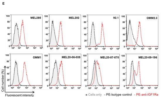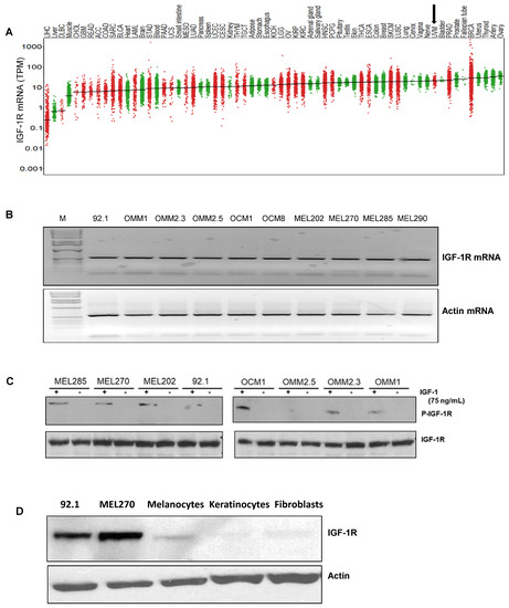 Expression of IGF-1R in UM tumors and cell lines. (A) The IGF-1R mRNA expression levels in tumor and normal tissues were compared in 33 cancer (red dots) and corresponding normal (green dots) tissues through TCGA database analysis. The expression in UM is indicated by an arrow. (B) RT-PCR analyses showing IGF-1R mRNA levels in 10 different UM cell lines. (C) Western blot analysis showing IGF-1R activation/induction in UM cell lines with 75 ng/mL of IGF-1 treatment for 10 min. (D) Western blot analysis for IGF-1R levels using IGF-1R antibody shows higher expression of IGF-1R protein in UM cell lines (92.1 and Mel270) vs. non-cancerous melanocytes, keratinocytes and fibroblasts. (E) FACS histogram plots showing cell surface expression of IGF-1R in the UM cell lines (Mel285, Mel202, 92.1, OMM2.3, OMM1, MEL20-06-039, MEL20-07-070 and MEL20-09-196) stained with IGF-1R antibody (red lines). The isotype control is represented by the black lines in the FACS histograms, and these experiments were repeated twice.