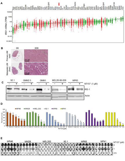 Small molecule inhibitor NT157 inhibits its target, IRS-1, by protein degradation [14]. We treated UM cells expressing IRS-1 with NT157 to inhibit IRS-1 activity and observed a reduction in IRS-1 protein levels as shown in western blots (Figure 2C, see full western blot images in Supplementary Materials). Since the reduction in IRS-1 is expected to affect cell survival [16], we tested the effect of NT157 on UM cell survival. Through MTT assays we observed inhibition of cell survival in all cell lines tested (Figure 2D). UM cell lines varied in sensitivity to NT157 treatment (2.5 µM), ranging between 40–85% reduction in cell survival. The NT157 IC50 concentrations are 1.062 µM, 3.165 µM, 0.689 µM, 1.761 µM, 0.756 µM, and 2.234 µM for MP46, MM28, MEL202, 92.1, MP65, MP41 cell lines, respectively. We also corroborated the observation from MTT assays through the colony formation assay. We treated MEL202, 92.1, MM28, MP38, MP41, MP46, and MP65 UM cell lines with NT157 in the colony formation assay and observed inhibition of colony growth or reduction in colony number (Figure 2E). The effect of NT157 on colony formation was quantitated by counting colonies from 10 fields/sample and was plotted as a bar graph (Figure S2). We again observed varied sensitivities to NT157 among the cell lines tested.