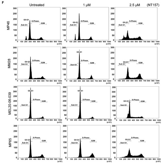 Shows percent cells gated in subG1 phase with /without treatment with NT157. The percent of cells in cell cycle phases was obtained by counting propidium iodide-stained cells after 48 h of NT157 treatment. At the higher NT157 concentration we see an accumulation of subG1 cells compared to the untreated controls.