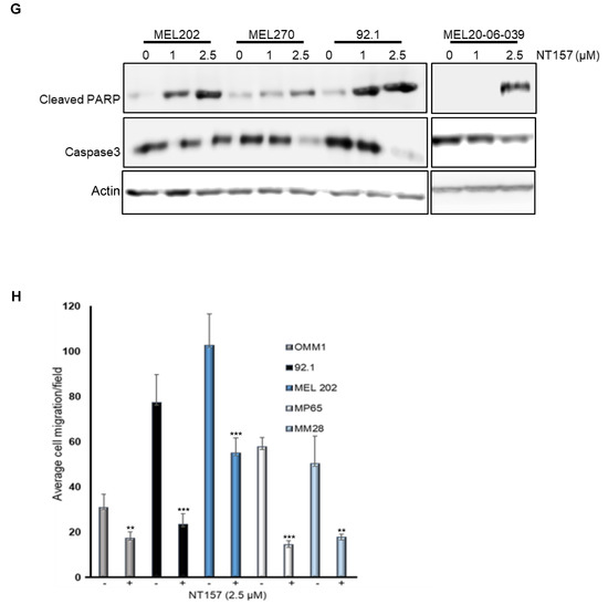 We also observed that NT157 induces apoptosis in UM cells, as evident from the dose-dependent increase in the subG1 population upon NT157 treatment, observed through FACS analysis after propidium iodide staining (Figure 2F and Table 1). To characterize whether this G0/G1 cell accumulation is due to apoptosis, we performed molecular analysis of the apoptotic marker using western blotting. We observed increased levels of PARP processing (cleaved PARP induction) as well as caspase 3 processing (reduction in caspase 3 protein levels) after NT157 treatment of UM cell lines (Figure 2G, see full western blot images in Supplementary Materials).