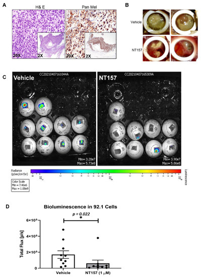 NT157 treatment reduces UM tumor growth in the chicken CAM model. (A) H&E (left) and pan melanoma cocktail (anti- HMB1, Tyrosinase, and S100 antibodies; right) staining of UM tumor tissues from 92.1 cells grown in chicken CAM model show the presence of melanoma cells. Representative (20×) and high magnification (inlay 2×) images shown as described. (B) Brightfield images of vehicle-treated (upper panel) and NT157-treated (1 µM; lower panel) representative tumors (two representative images per treatment) show a reduction of tumor size with NT157 treatment for four days. (C) Representative bioluminescence images of chicken eggs bearing luciferase-tagged UM cells (92.1) treated with vehicle controls (left panel) or NT157 (1 µM for four days) (right panel). (D) Tumor size of the implants was calculated as the total flux (photons per second) from the images in (C), which shows a reduction in tumor size with NT157 treatment; mean ± SD of three independent experiments was plotted as a graph; * p = 0.022. A student t-test was used for statistical analysis.