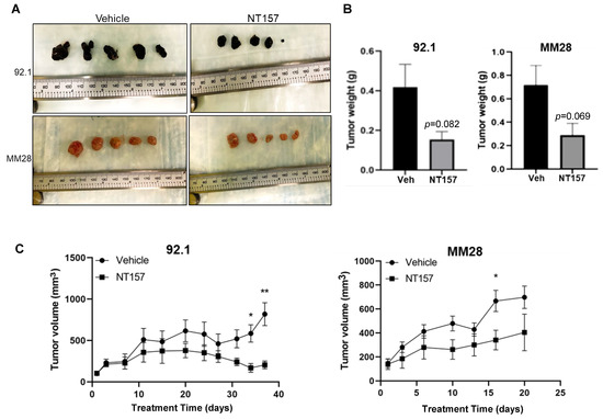 To complement the chicken CAM model data, the efficacy of targeting IRS-1 using NT157 was also examined using subcutaneous (subQ) UM models in mice (see Materials and Methods). Xenograft tumors were generated using the UM cell lines 92.1 and MM28 in NSG mice. Five mice were treated with vehicle and five others with NT157. Treatment with NT157 strongly suppressed UM tumor growth as compared to the untreated control models (Figure 5A,C). We observed a reduction in the average UM xenograft tumor weight at the end of the experiments between the NT157 and vehicle-treated groups (Figure 5B). Therefore, in these experiments, we validated in vivo the inhibitory effect of IRS-1 blocking on tumor cell growth. There were no significant changes in the average body weights of mice in the NT157-treated vs. vehicle-treated group demonstrating that the dose of NT157 chosen for treatment was well-tolerated.