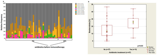 (a) Plot showing the relative frequency of bacterial phylum based on 16S rRNA of 47 stool samples from NSCLC patients treated or not treated with antibiotics; (b) boxplot showing Bacteroidota content depending on antibiotic therapy up to 4 weeks before immunotherapy.