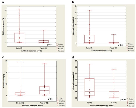 The analysis showed that treatment with antibiotics up to 4 weeks before the immunotherapy cause an increase in Bacteroidota abundance (p = 0.03, Figure 1b). In patients treated with antibiotics before immunotherapy, there was a reduced abundance of bacteria from the Bifidobacteriaceae group (p = 0.03) and Clostridia UCG-14 (p = 0.03). Furthermore, in this group of patients, an increased percentage of Rikenellaceae (p = 0.04) was observed (Figure 2a–c, respectively) regardless of immunotherapy lines.