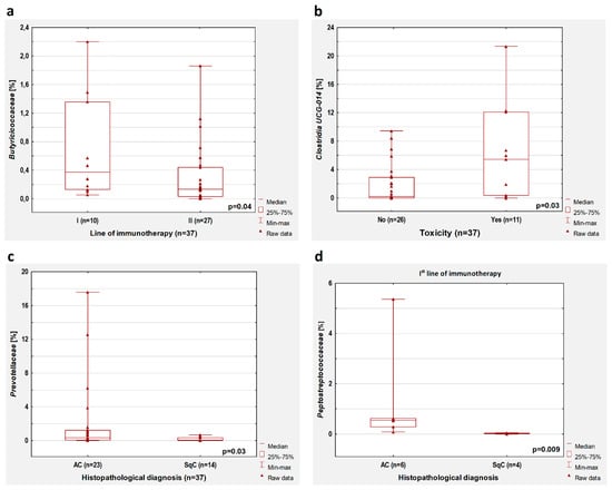 Boxplots showing the content of (a) Butiriciococcaceae depending on the line of immunotherapy; (b) Clostridia UCG-014 depending on immunotherapy toxicity; (c) Prevotellaceae depending on the histopathological diagnosis; (d) Peptostreptococcaceae depending on the histopathological diagnosis in patients who received first-line immunotherapy. All results concern the patients untreated with antibiotics before immunotherapy.