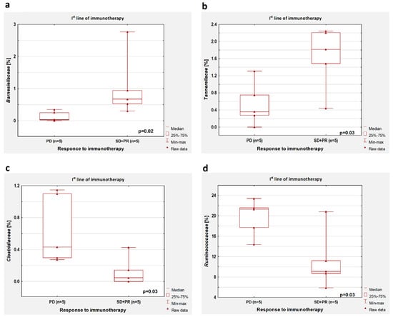 In patients untreated with antibiotics, a higher percentage of Barnesiellaceae (p = 0.02, Figure 4a) and Tannerellaceae (p = 0.03, Figure 4b), as well as a lower abundance of Clostridiaceae (p = 0.03, Figure 4c) and Ruminococcaceae (p = 0.03, Figure 4d), were observed in patients with disease control during first-line immunotherapy compared to patients with disease progression.