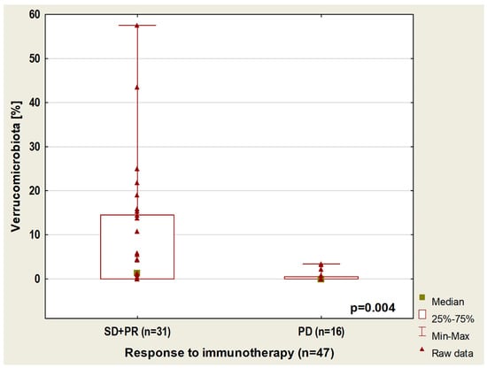 In the whole group of patients (with or without antibiotic history), we found that the content of Verucomicrobiota taxa is higher in patients with disease control compared to those with disease progression regardless of the line of treatment (p = 0.004, Figure 5). Moreover, in this group of 47 patients, a higher percentage of Barnesiellaceae (p = 0.005) and Tannerellaceae (p = 0.01), as well as a lower abundance of Clostridiaceae (p = 0.01), were observed in patients with disease control compared to patients with disease progression during first-line immunotherapy. A significantly lower abundance of Clostridiaceae was also shown in patients with disease stabilization (SD) or partial response (PR) than in patients with progression disease (PD) regardless of the line of immunotherapy (p = 0.02).