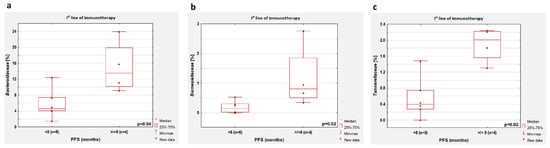 Differences in the abundance of individual bacteria in patients with PFS shorter and longer than 6 months. Boxplots showing the content of (a) Bacteroidaaceae, (b) Barnesiellaceae, and (c) Tannerellaceae in the group of patients treated with first-line immunotherapy.