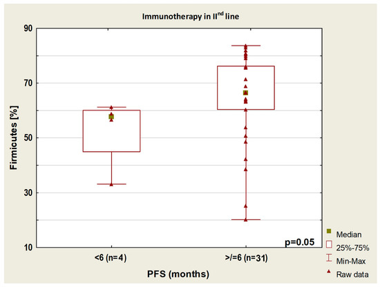 In patients treated and untreated with antibiotics, the group with longer PFS had a higher abundance of Barnesiellaceae than the group with shorter PFS (p = 0.01). In patients treated with second-line immunotherapy, the group with PFS higher than 6 months had a higher content of Firmicutes than the group with PFS lower than 6 months (p = 0.05, Figure 7).