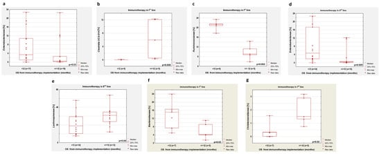In the group of patients previously untreated with antibiotics, we observed (regardless of the line of immunotherapy) a lower percentage of Enterobacteriaceae in patients with OS longer than 12 months compared to patients with OS below one year (p = 0.03, Figure 8a). In the first-line immunotherapy group, higher percentages of Clostridia UCG-014 and a lower content of Ruminococcaceae were shown in patients with OS above 12 months compared to patients with OS below this value (p = 0.008, Figure 8b and p = 0.002, Figure 8c, respectively). In patients who received second-line immunotherapy, an OS greater than 12 months was related to a lower abundance of Enterobacteriaceae and a higher percentage of Lachnospiracea (p = 0.005 and p = 0.04, respectively; Figure 8d,e, respectively).