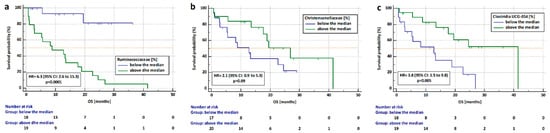Analysis of overall survival in patients who received Immunotherapy depending on the content of (a) Ruminococcaceae), (b) Christensenalceae, and (c) Clostridia UCG-014 regardless of immunotherapy line in the group untreated with antibiotics up to 4 weeks before immunotherapy.
