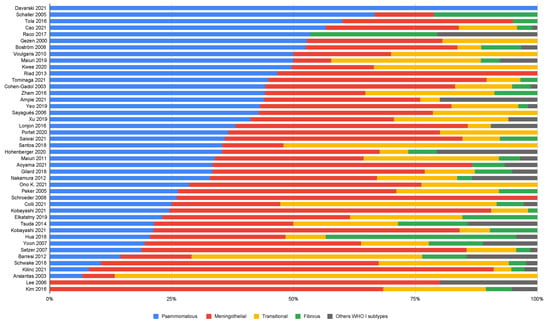 In summary, the most common histological subtype across studies was any of the four dominating subtypes, i.e., Psammomatous, Meningothelial, Transitional, and Fibrous. The pooled analysis revealed that this order was the same as the frequency order of these subtypes.