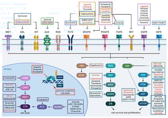Kinase inhibitors and their targets discussed in this review. Inhibitors highlighted with red color are currently (November 2022) under clinical trials. The colors of the frames around the inhibitors represent the colors used for the kinases they inhibit. Created with BioRender.com.
