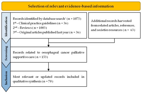 Figure 1. Flowchart of selection of relevant evidence-based information on palliative supportive care of oesophageal cancer. * PubMed search heading: ((supportive care) OR (palliative)) AND ((oesophag *) OR (esophag *)) AND ((cancer) OR (carcinoma)), last executed on 25 August 2022.