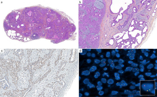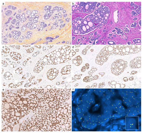 - Makretsov, N.; He, M.; Hayes, M.; Chia, S.; Horsman, D.E.; Sorensen, P.H.B.; Huntsman, D.G. A fluorescence in situ hybridization study of ETV6-NTRK3 fusion gene in secretory breast carcinoma. Genes Chromosomes Cancer 2004, 40, 152–157. [Google Scholar] [CrossRef] [PubMed]