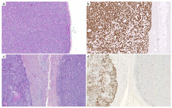 Immunohistochemistry: There is no specific immunostain for myoepithelial differentiation. Myoepitheliomas generally exhibit the expression of cytokeratins, S100 (70–80%), SOX10 (30–82%), calponin (86%), EMA (65%), GFAP (45%), SMA (35%), desmin (15%), and p63 (15%) [77,78,79]. Syncytial myoepitheliomas lack cytokeratins expression [80].
