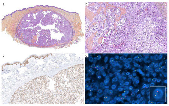 - Macagno, N.; Kervarrec, T.; Sohier, P.; Poirot, B.; Haffner, A.; Carlotti, A.; Balme, B.; Castillo, C.; Jullie, M.-L.; Osio, A.; et al. NUT is a specific immunohistochemical marker for the diagnosis of YAP1-NUTM1-rearranged cutaneous poroid neoplasms. Am. J. Surg. Pathol. 2021, 45, 1221–1227. [Google Scholar] [CrossRef] [PubMed]