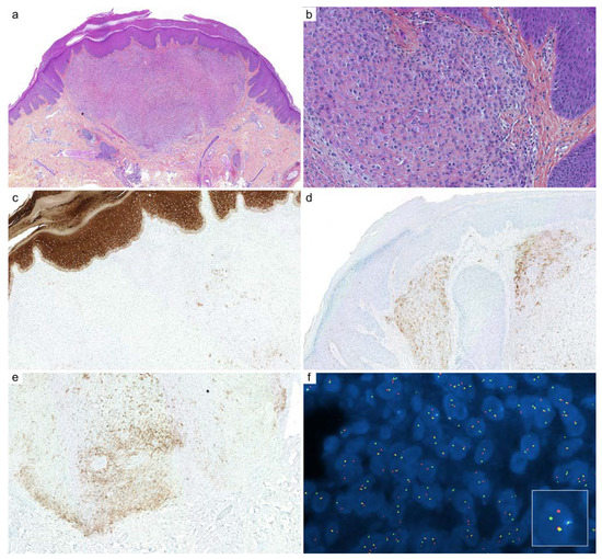 Cutaneous syncytial myoepithelioma: (a) this variant of myoepithelioma occurs predominantly in the superficial dermis (×25); (b) epithelioid and plasmacytoid cells are arranged in sheets with little or no intervening stroma (×200); (c) AE1/AE3 immunohistochemistry is most often negative or stains only scattered isolated cells (×100); (d) PS100 (×100) and (e) EMA immunohistochemistry stains various populations of cells (×100); (f) fluorescence in situ hybridization (FISH, break-apart) demonstrates clonal rearrangement of EWSR1 gene (×1000).