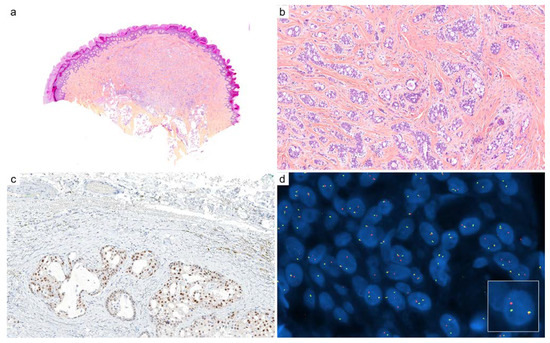 Cutaneous secretory carcinoma: (a) circumscribed intradermal neoplastic proliferation (×10); (b) intracytoplasmic secretory vacuoles and extracellular bubbly eosinophilic secretions (×100); (c) nuclear staining with panTRK immunohistochemistry is highly suggestive of ETV6::NTRK3 fusion (×200); (d) fluorescence in situ hybridization (FISH, break-apart) demonstrates clonal and balanced rearrangement of NTRK3 gene (×1000).