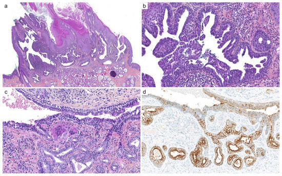 - Hsieh, M.-S.; Bishop, J.A.; Wang, Y.-P.; Poh, C.F.; Cheng, Y.-S.L.; Lee, Y.-H.; Jin, Y.-T.; Chang, J.Y.F. Salivary Sialadenoma papilliferum consists of two morphologically, immunophenotypically, and genetically distinct subtypes. Head Neck Pathol. 2020, 14, 489–496. [Google Scholar] [CrossRef] [PubMed]