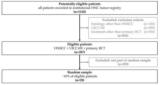 From 1100 potentially eligible patients 823 did not meet the inclusion criteria. From the remaining 287 patients a representative random sample of 28 patients (~10%) was drawn with SPSS 27 (IBM, Armonk, NY, USA). The study flow diagram and patient inclusion, modified according to STARD criteria [19], is depicted in Figure 1.