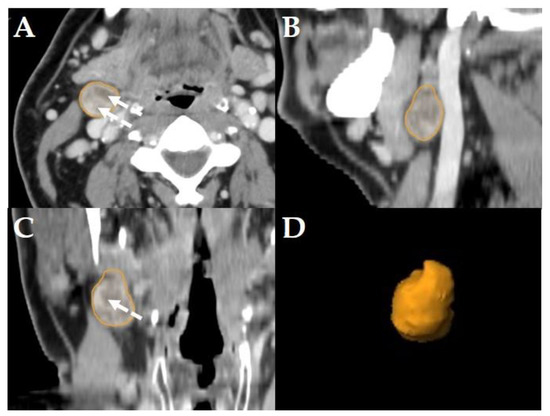 Consequently, in this study, ultrasound-guided core needle biopsies or fine-needle aspirations were not used; instead, classification of segmented LNs as “pathologic with ECS” (Figure 2), “pathologic” (Figure 3) and “non-pathologic” (Figure 4) was completed by two experienced readers in head-and-neck-radiology based on established criteria [5,6,7] and was defined as the reference method. While there might be a risk of incorrect classification this was considered the safest approach for the patients.