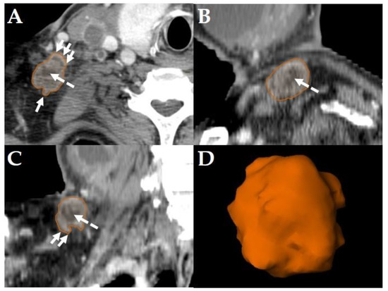 Example of a LN classified as “pathologic” in a staging-CT of a 55-year-old, male HNSCC patient with a tumor of the oral cavity staged cT4a cN2b cM0. Original segmentation in the axial plane (A); sagittal (B) and coronal (C) reformatted views and three-dimensional rendering (D) of the LN are provided by the software. Dashed arrows show central necrosis; no soft tissue infiltration and irregular LN capsule was observed.