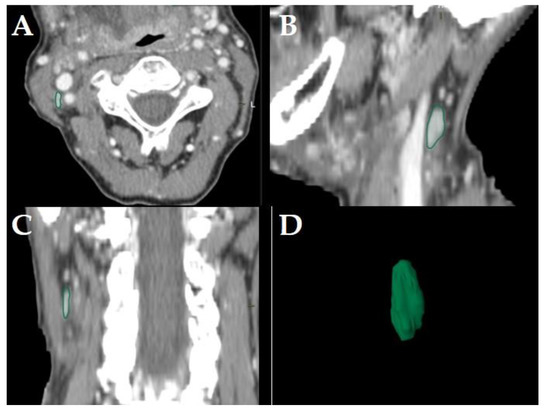 Example of a LN classified as “non-pathologic” in a staging-CT of a 65-year-old, female HNSCC-patient with a tumor of the oral cavity staged cT4a cN2c cM0. Manually segmented LN in the axial plane (A); sagittal (B), coronal (C) reformatted views and three-dimensional rendering (D) of the LN are provided by the software. Neither central necrosis nor soft tissue infiltration nor irregular LN capsule were observed for this LN.