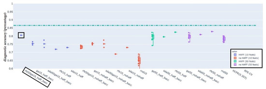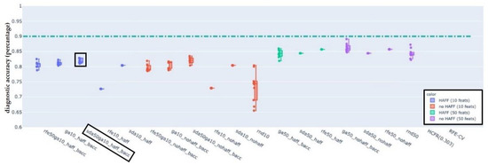 Balanced accuracy distributions of EFS-algorithms trained and evaluated on the LN-label “non-pathologic”. For reference, the BACC of the LDA classifier without feature count reduction (dash-dotted green horizontal line at 0.90). The combination of SDA and GA (black box) appeared to be the potentially most useful EFS-algorithms, retaining a diagnostic accuracy of >83% with only 10% of the features.