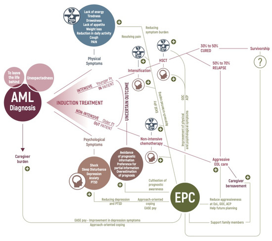 Effects of the early integration of palliative care on the disease trajectory of patients with acute myeloid leukemia. AML = acute myeloid leukemia; Pt = patients; PTSD = post-traumatic stress disorder symptoms; EASE = Emotion And Symptom-focused Engagement; psy = psychotherapeutic intervention; phy = screening of physical symptoms with targeted referral to palliative care; EPC = early palliative care; HSCT = hematopoietic stem cell transplant; GOC = goals of care discussions; ACP = advance care planning; EOL = end-of-life; ? = doubts about the possibility that EPC might be the best model for providing assistance and support to the population of AML patients cured of long-term therapy-related symptoms and mental health effects.
