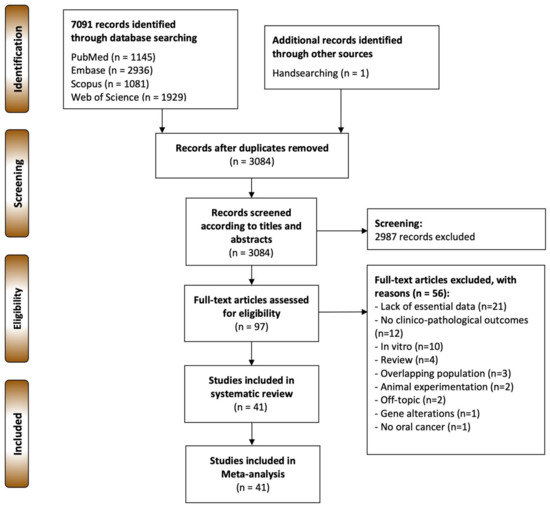 The flow diagram in Figure 1 depicts the study selection process and the results obtained. A total of 7091 publications were retrieved: 2936 from Embase, 1929 from Web of Science, 1145 from PubMed, 1081 from Scopus, and one from a screening of the reference lists. After duplicate removal, 3084 records were considered potentially eligible and their titles and abstracts were screened, leaving a sample of 97 papers for full-text evaluation (the studies excluded and their exclusion criteria were listed in the Supplementary Materials). Finally, 41 studies meeting all eligibility criteria were included for qualitative evaluation and meta-analysis [12,38,39,40,41,42,43,44,45,46,47,48,49,50,51,52,53,54,55,56,57,58,59,60,61,62,63,64,65,66,67,68,69,70,71,72,73,74,75,76,77].