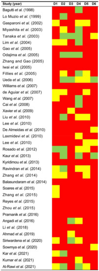 The risk of this bias was high in 70.73% of the reviewed studies, moderate in 26.83%, and low in 2.44%. Studies offering an inadequate description of their samples (sex and age of patients, oral cancer subsites, etc.) or setting (recruitment place and period) were considered as potentially biased.