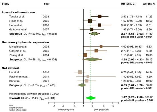 Heterogeneity between studies was assessed using the χ2-based Cochran’s Q test. Given the low statistical power of this test, p < 0.10 was considered significant. We also used Higgins I2 statistic to estimate what proportion of the variance in observed effects reflects variation in true effects, rather than sampling error. The percentage of inter-study heterogeneity was quantified considering values of 50–75% as a moderate-to-high degree of inconsistency [30,31]. Preplanned subgroup meta-analyses (by subcellular distribution, geographical area, immunohistochemical methods, and risk of bias) were performed to identify potential sources of heterogeneity and to potential study subpopulations. Furthermore, additional univariable random-effect meta-regression analyses were conducted, using the restricted maximum likelihood (REML) method, to explore the potential effect of additional study covariates (i.e., follow-up period, age, sex, and clinical stage) [32]. Considering the low number of studies with data available for meta-regression analyses, the p-values were re-calculated using a permutation test based on Monte Carlo simulations [33]. To obtain sufficient precision, the number of permutations was 10,000 [34]. Weighted bubble plots were also constructed to graphically represent the fitted meta-regression lines.