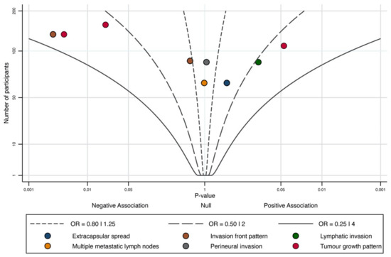 Finally, the meta-analysis of secondary clinicopathological parameters (i.e., number of metastatic lymph nodes, extracapsular spread, tumour growth pattern, mode of invasion in tumour front, perineural and lymphatic invasion) could not be performed due to the low number of observations extracted and a considerable degree of clinical and methodological heterogeneity. However, due to their potential prognostic implications, an albatross plot was constructed to graphically represent them [37], allowing an approximate examination of their underlying magnitudes of effect. Stata software was used for all statistical analyses (v.16.1, Stata Corp, College Station, TX, USA).