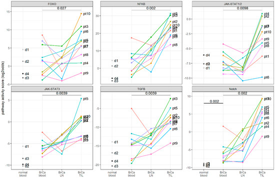 3.4. Clinical Study: Signaling Pathway Activity in CD4+ T Cells Derived from Blood, Lymph Nodes, and Breast Cancer Tissue Samples of Patients with Primary Breast Cancer