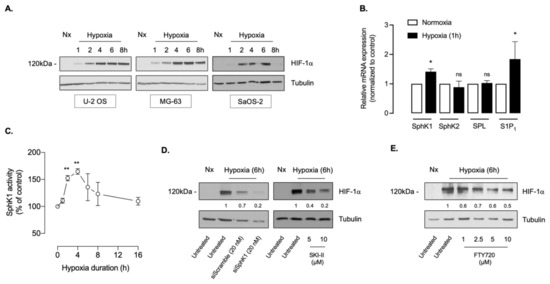 In agreement with work conducted by others [47,48,49,50,51,52], hypoxia was associated with increased HIF-1α accumulation in U-2 OS, MG-63 and SaOS-2 cell lines, peaking at 4–6 h of treatment (Figure 1A). Because we previously reported that the SphK1/S1P pathway is a regulator of both HIF-1α and HIF-2α during hypoxia in multiple cancer cell lineages [25,26,27,38], we evaluated its relevance with regard to HIF-1α expression in osteosarcoma cells. ln line with our previous findings in renal cell carcinoma models [27], we found an increase in SphK1 and S1P receptor 1 (S1P1) mRNA expression after 60 min of hypoxia in the U-2 OS cell model (Figure 1B). On the contrary, as shown in Figure 1B, there was no change of mRNA expression for both SphK2, the other sphingosine kinase isoform, and for S1P lyase (SPL), the S1P-degrading enzyme.