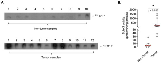 Sphingosine kinase-1 (SphK1) enzymatic activity was assessed in human biopsies (10 nontumor and 12 tumor individual samples). As a whole, mean SphK1 activity was 432 pmol/min/mg (95% CI: 77.4–835) in tumor samples versus 6.3 (95% CI: 0.45–12.1) in noncancerous tissue, accounting for a statistically significant (p = 0.023) increase in osteosarcoma tissue compared to normal bone, suggesting that S1P is abundantly generated in osteosarcoma tissues (Figure 2).
