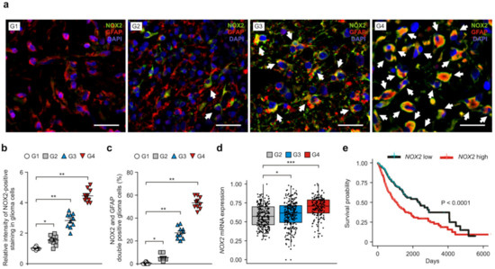 The levels of NOX2 are elevated in patients with GBM compared to low-grade glioma. (a) Representative immunofluorescence images of NOX2 staining in patients with GBM (G4), G3 glioma (G3), G2 glioma (G2), and G1 glioma (G1) showing NOX2 (green), GFAP (red, glioma cells), and DAPI-stained nuclei (blue) (n = 3 per group, n = 10 images per individual subject). Scale bars, 20 μm. White arrows indicate NOX2 and GFAP-positive glioma cells. (b,c) Relative intensity of NOX2-positive staining (b) and quantification of NOX2 and GFAP-positive glioma cells (c) from (a). (d) The levels of NOX2 mRNA in patients with GBM and LGG dataset from TCGA. Wilcoxon test with two-sided and one-sided. (e) The survival curve of patients with low (black) (n = 347) and high levels (red) (n = 346) of NOX2 mRNA (n = 693) from GBM and LGG datasets from TCGA. The two groups were divided according to median value. p < 0.0001; Kaplan–Meier estimation test with two-sided and one-sided. The results are representative of three independent experiments and are shown as the mean ± SEM. *** p < 0.001, ** p < 0.01, * p < 0.05; ANOVA or Student’s two-tailed t-test.