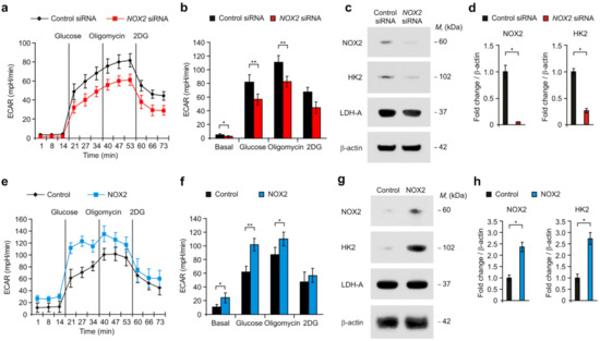 NOX2 induces the activation of HK2-dependent glycolysis in human glioma cells. (a) The levels of extracellular acidification rate (ECAR) for glycolysis of glucose and (b) quantification of ECAR levels in human glioma cells treated with NOX2 siRNA or control siRNA. (c) Representative immunoblot images and (d) quantification of NOX2, HK2, and LDH-A protein levels in human glioma cells treated with NOX2 siRNA or control siRNA. β-actin was used as a loading control. (e) The levels of extracellular acidification rate (ECAR) for glycolysis of glucose and (f) quantification of ECAR levels in human glioma cells with NOX2 over-expression or control. (g) Representative immunoblot images and (h) quantification of NOX2, HK2, and LDH-A protein levels in human glioma cells with NOX2 over-expression or control. Β-actin was used as a loading control. The results are representative of three independent experiments and are shown as the mean ± SEM. ** p < 0.01, * p < 0.05; ANOVA or Student’s two-tailed t-test.