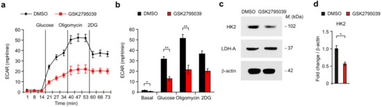 Next, we investigated whether NOX2 could affect high glycolytic activity in human glioma cells. We analyzed the effects of NOX2 knockdown in the activation of HK2-dependent glycolysis in U87MG glioma cells (Figure 2a). We measured the extracellular acidification rate (ECAR) as a surrogate of glycolysis activity by the quantification of lactate production. The glycolytic activity was measured by the sequential addition of glucose, the substrate of glycolysis; oligomycin, a selective inhibitor of mitochondrial respiration; and 2-deoxyglucose (2-DG), a specific inhibitor of glycolysis (Figure 2a). NOX2 knockdown significantly suppressed the levels of ECAR in response to glucose relative to the control (Figure 2a,b). Next, we examined whether NOX2 could regulate the expression of HK2, the first key enzyme in the glycolysis pathway, in U87MG glioma cells. NOX2 knockdown reduced the protein levels of HK2 compared to the control, whereas the protein levels of lactate dehydrogenase-A (LDH-A), an enzyme for the final step of glycolysis, were not changed (Figure 2c,d). Consistently, the over-expression of NOX2 resulted in the higher ECAR levels in response to glucose than that in the control (Figure 2e,f). The over-expression of NOX2 increased the protein levels of HK2 relative to the control, whereas the protein levels of LDH-A were comparable (Figure 2g,h). Moreover, the inhibition of NOX2 activity by GSK2795039, a selective NOX2 inhibitor, significantly suppressed the levels of ECAR in response to glucose and the protein levels of HK2 relative to the control (Figure 3a,b). GSK2795039 decreased the protein levels of HK2 relative to the control, whereas the protein levels of LDH-A were comparable (Figure 3c,d). These results suggest that NOX2 induces the activation of HK2-dependent glycolysis in human glioma cells.