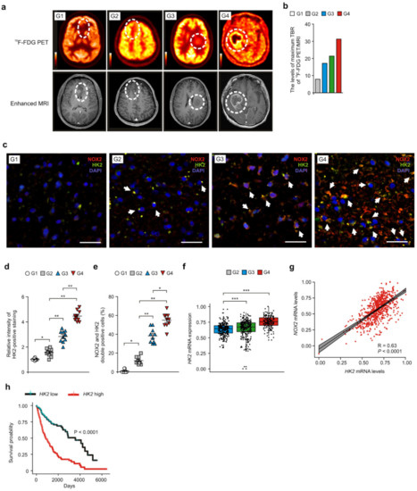 Next, we investigated whether high levels of NOX2 contribute to high levels of glucose uptake and HK2 expression in patients with GBM. First, we analyzed the levels of glucose uptake in patients with glioma using 18F-FDG PET with MRI analysis. The high radiomics signature of glucose uptake and the levels of maximum TBR in the 18F-FDG PET/MRI images were significantly elevated in patients with GBM relative to those in G1–G3 glioma patients (Figure 4a,b). We analyzed the protein levels of HK2 in NOX2-positive glioma cells of patients with GBM using immunofluorescence staining (Figures 4c and S3). The intensity of HK2-positive staining and the number of cells that have subcellular co-localization of HK2 and NOX2 were elevated in patients with GBM (G4) and G3 glioma relative to those in patients with low-grade glioma (G1, G2) (Figure 4d,e). Notably, the levels of HK2 and the number of cells that have subcellular co-localization of HK2 and NOX2 were significantly increased in patients with GBM relative to those in G2 and G3 gliomas (G2, G3) (Figure 4d,e). Similar to the cohort I, the levels of HK2 and NOX2 were elevated in patients with G3 glioma (G3) relative to those in G1 and G2 gliomas (G1, G2) in the cohort II (Table S2 and Figure S4a). The intensity of HK2-positive staining in NOX2-positive staining (Figure S4a–c) and the number of cells showing subcellular co-localization of HK2 and NOX2 were increased in patients with G3 glioma (G3) relative to those in G1 and G2 gliomas (G1, G2) (Figure S4d). Moreover, the levels of the HK2 gene were significantly elevated in GBM (G4) compared to G2 glioma (G2) in the analysis of the GBM and LGG datasets from TCGA (Figure 4f) and REMBRANDT (Figure S5). The expression levels of HK2 and NOX2 mRNA were positively correlated in patients with glioma in the analysis of the GBM and LGG datasets from TCGA (Figure 4g). The high levels of the HK2 gene were associated with the poor survival of patients with glioma in the analysis of the GBM and LGG datasets from TCGA (Figure 4h). These results suggest that high levels of NOX2 contribute to high levels of glucose uptake and HK2 expression in patients with GBM.